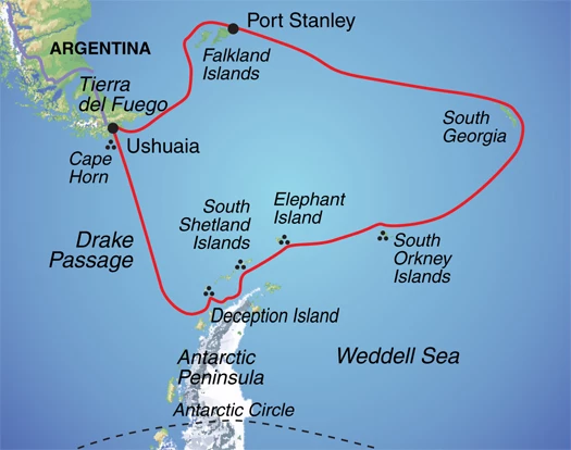 The journey begins in the Falklands with its large population of Rockhopper and Magellanic penguins, along with Black-browed albatross. In South Georgia, the ship threads her way through magical fjords to Salisbury Plain and Gold Harbour, places so remote that they have evolved into astonishing wildlife havens boasting a 100,000-plus population of King penguins on their beaches.The voyage continues to an enchanted world of icebergs and ice-covered mountains in the bays and channels of the Antarctic Peninsula. This is home to an extraordinary array of wildlife: penguins of almost all descriptions, Leopard and smaller seals, and three or four species of whales.