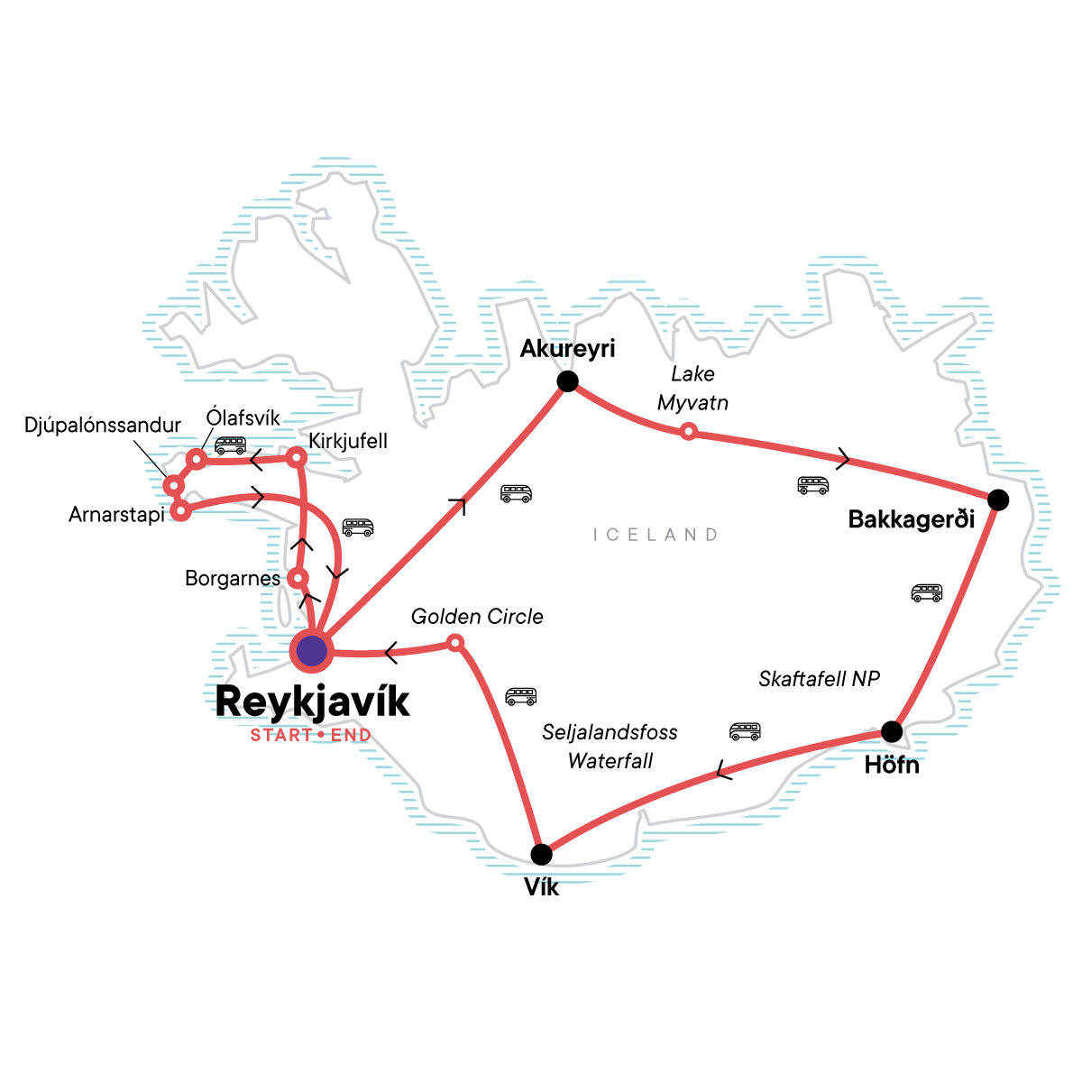 Your Wellness Moment: Sky Lagoon Geothermal Hot Springs, Reykjavik. Local guesthouse stay (Borgarfjörður). Mývatn lake visit. Vatnajökull glacier visit. Jökulsárlón glacier lagoon visit. Reynisfjara beach. Seljalandsfoss waterfall. The Golden Circle: Gullfoss waterfall, Geysir Hot Springs, and Þingvellir National Park. Enjoy a soak in Sky Lagoon just outside of the city. Day tour of the Snæfellsnes Peninsula. All transport between destinations and to/from included activities.