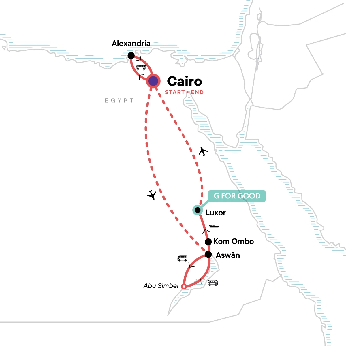 Your Local Living Moment: Lunch with a Local Family, Luxor. Arrival transfer. All entrance fees to included monuments. Guided tour of the Pyramid of Giza and the Sphinx. Visit the Library of Alexandria, catacombs, and Pompey’s Pillar. Guided visit of the Egyptian Museum. Tour of Abu Simbel. Three-night Nile cruise. Tour of Kom Ombo Temple. Visit the Colossi of Memnon. Cycle and Funtasia Project visit. Excursion to the Valley of the Kings, Hatshepsut, Luxor and Karnak Temples. All transport between destinations and to/from included activities.