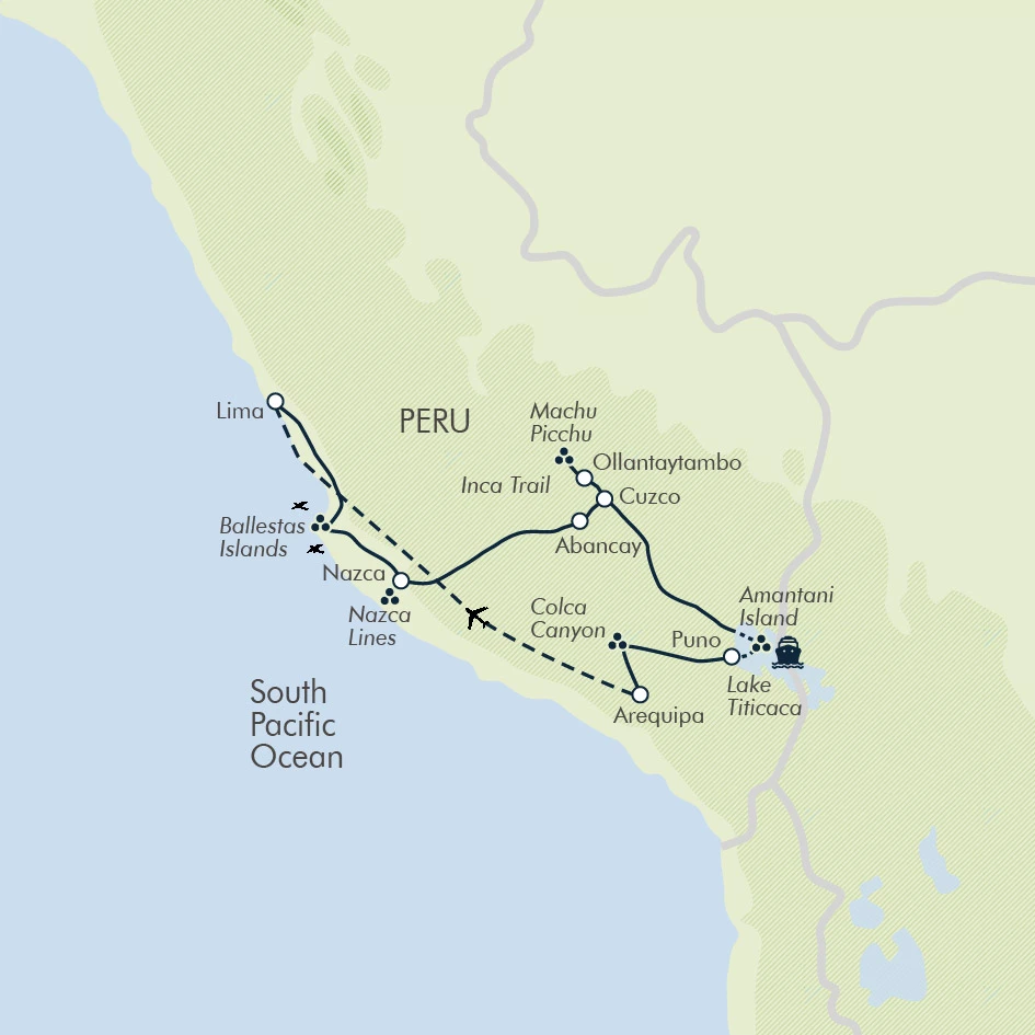 Journey through the vastly contrasting visual and cultural landscapes of Peru, including coastal desert, snow-capped Andean peaks, the altiplano and cloud forest. Along the way, visit world-renowned highlights, including: the mysterious Nazca Lines; Machu Picchu; Lake Titicaca, where we spend the night in an island homestay; and the 9,843ft (3,000m) deep Colca Canyon. We also encounter traditional culture, condors, llamas, and a warm welcome from the Peruvian people.