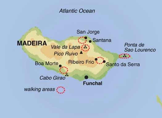Surging from the Atlantic Ocean, Madeira offers a temperate sub-tropical paradise perfect for year-round walking. One of Madeira's many charms is its infinite variety; each day's walking and every levada - the island's unique network of water channels - is different. Landscapes vary from cultivated vine terraces and verdant slopes dotted with white hamlets to coastal cliffs with balcony views over the azure seas. Also a nature lover's paradise, there are over 120 endemic species of flora and fauna including the pride of Madeira, the bird-of-paradise, along with jacaranda, tiny bisbis birds, chaffinches and hawks - the list is endless. On this Self Guided walking holiday in Madeira, hotel-to-hotel holiday, the island's coastal paths and levadas take you from the sleepy wine village of Santana on the north coast to bustling Funchal in the south. Fringed with a rainbow of colourful flora, the levadas lead you inland to breezy Santo da Serra; a transfer then takes you to the Levada do Norte for spectacular views from the cliff tops.