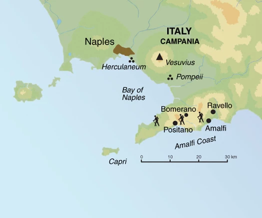 The Amalfi Coast is one of the most dramatic and beautiful coastlines in Europe. Mountains rise steeply out of the Mediterranean far below and picturesque towns nestle neatly in isolated coves. This self-guided walking holiday sees you descend from your quiet base in Agerola, following mule tracks and old paths through hillside villages, lemon groves and beautiful deep gorges to towns with narrow streets, whitewashed buildings and fascinating churches, monasteries and cathedrals. Away from the trails there is plenty of time to partake in the traditional Amalfi pastimes of sampling incredible food and wine, as well as enjoying the Mediterranean climate. A highlight of this Amalfi Coast tour is one of the world's greatest walks, trekking on the 'Path of the Gods'. A visit to the Bay of Naples would not be complete without seeing the incredible Roman remains of Pompeii beneath the volcanic cone of Vesuvius.