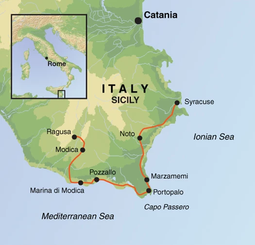 Your journey takes you along a mix of inland and coastal routes, starting amidst the Baroque splendour of Ragusa and Modica and ending in stunning Siracusa on the east coast. You'll cycle through lush valleys filled with olive trees, almond groves, vineyards and citrus orchards and patchwork puzzles of dry-stone-wall farms, as you cycle between UNESCO World Heritage Sites rebuilt in the typical late Baroque style after the famous 1693 earthquake. You'll take in plenty of Inspector Montalbano country - a treat for fans of the fictional detective series - including Scicli with its atmospheric streets and hilltop mausoleum as well as the charming fishing villages of Punta Secca and Sampieri. Following the scenic Mediterranean Route cycleway you'll head towards the sea, taking in sublime coastline, punctuated by golden sandy beaches and picturesque fishing villages such as Portopalo di Capo Passero and pretty Marzamemi with its Arab history. After passing through Nero D'Avola wine country your holiday finishes in beautiful Siracusa, an ancient Greek city whose 'historical heart' is the island of Ortigia, accessed by a bridge from the mainland. Ortigia's grand squares, narrow medieval streets and romantic palaces and castles are a delight to behold.