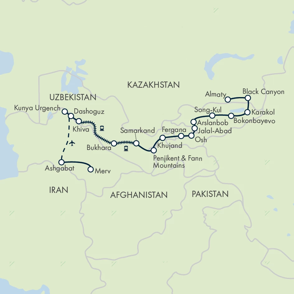 Vast deserts, open steppe, fertile valleys and striking mountain ranges shape the landscapes of the Five Stans, the five former Soviet republics of Central Asia. Their towns and cities reveal the movement of armies, traders, and scholars over millennia: Greek and Persian campaigns, Mongol expansion, Silk Road exchange, ambitious astronomers, and Soviet-era experiments. Encounter traditional villages, intricately tiled madrassas, alpine lakes, lively markets and wide boulevards − a vivid portrait of a region where histories overlap and contemporary Central Asian culture continues to evolve in fascinating ways. About this trip: We have two versions of this trip. One starts in Ashgabat, Turkmenistan, and ends in Almaty, Kazakhstan, and the other runs in reverse. Apart from the direction of travel, the two itineraries are similar – the main difference is the route taken through Kyrgyzstan and the accommodation there. This itinerary runs from Turkmenistan to Kazakhstan, includes Son Kul Lake, and has two nights staying in yurts in Kyrgyzstan. The reverse itinerary includes Chon-Kemin and Bishkek and stays in guesthouses and hotels rather than yurts.