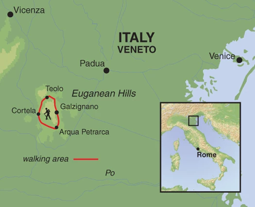 This walking holiday is based in the wonderfully unspoilt Euganean Hills, tucked in a quiet corner below the beautiful medieval city of Padua, west across the plain from Venice.